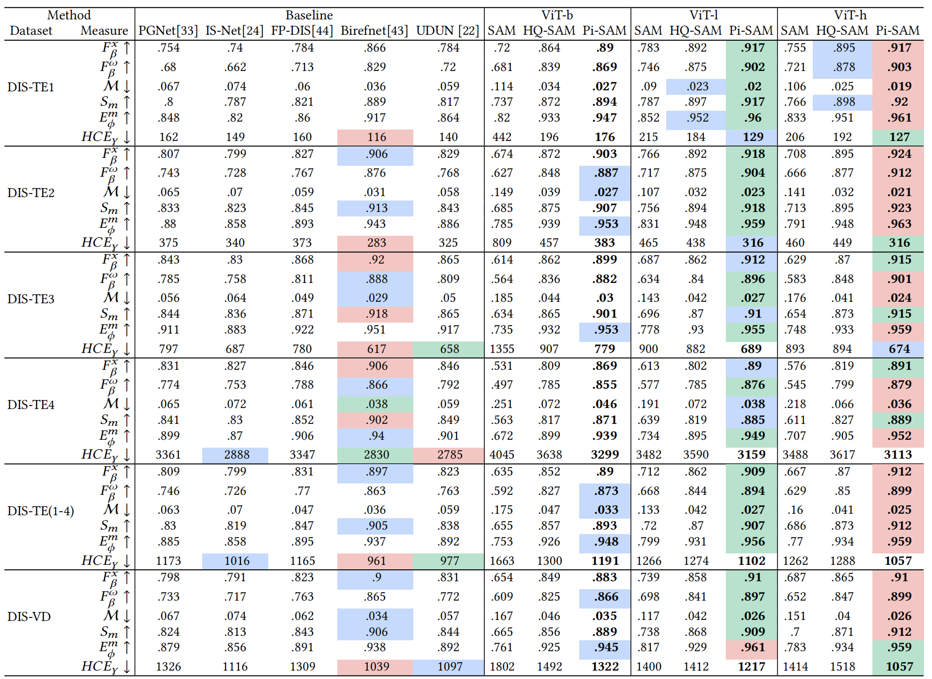 表1:DIS5K数据集上的结果。在三种基于SAM的方法中,我们对每种ViT版本的最佳结果进行了加粗处理。在所有方法的比较中,前1、2和3的结果分别用红色、绿色和蓝色突出显示。