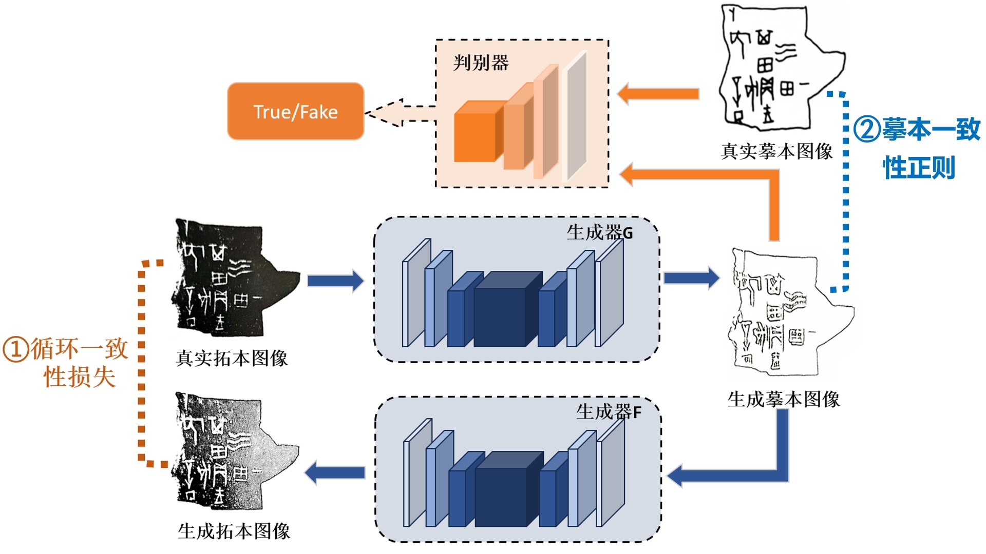 使用预训练+精训练两步走的方式充分利用数据训练,研制出首个甲骨拓本-摹本风格转换模型,判别器模型准确率达到99.90%,实现高质量的甲骨拓本-摹本转换;