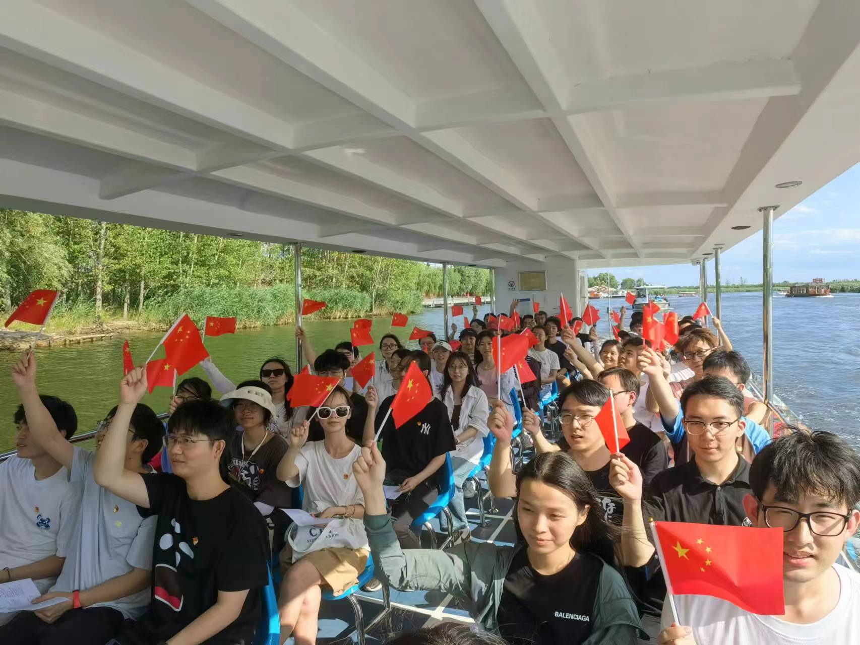红歌唱响白洋淀,在回程船上党员同志们齐唱起《没有共产党就没有新中国》、《打靶归来》,铿锵有力的歌声回荡在芦苇荡间。