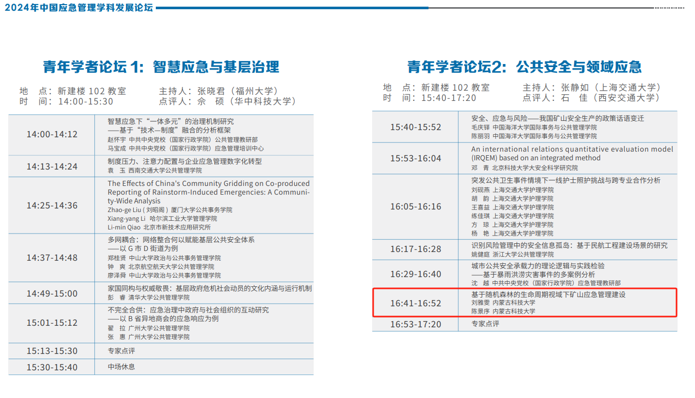 本次会议设立“青年学者论坛”。beat365硕士研究生提交了论文《基于随机森林的生命周期视域下矿山应急管理建设》,并在青年学者论坛中以口头报告形式进行了分享与交流。研究立足于矿山应急文化建设,运用随机森林算法技术探究在矿山应急管理建设不同生命周期下应急文化因素所呈现的影响性。
