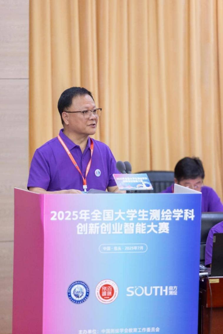 教指委主任委员、测教委主任委员、中国工程院院士、中南大学校长李建成在开幕辞中介绍了今年赛事的筹备和参赛情况,他说,当前,全球科技创新空前活跃,新一轮科技革命和产业变革深入发展,以宇树科技四足机器人、深度求索的Deepseek等为代表的“杭州六小龙”,用硬科技重新定义中国创新。这些技术也为测绘学科的发展带来了新的机遇,测绘学科已进入智能化、实时化、泛在化、服务化的崭新发展阶段,“智能测绘”成为引领未来的鲜明方向。这要求我们更要拥抱变革、勇于创新,将智能技术深度融入测绘全链条,开拓学科发展新境界。他寄望所有参赛选手能够勇做创新创造的“攀登者”,锤炼知行合一的“实干家”、凝聚团结协作的“弄潮儿”,争取早日成为测绘行业领军人才。