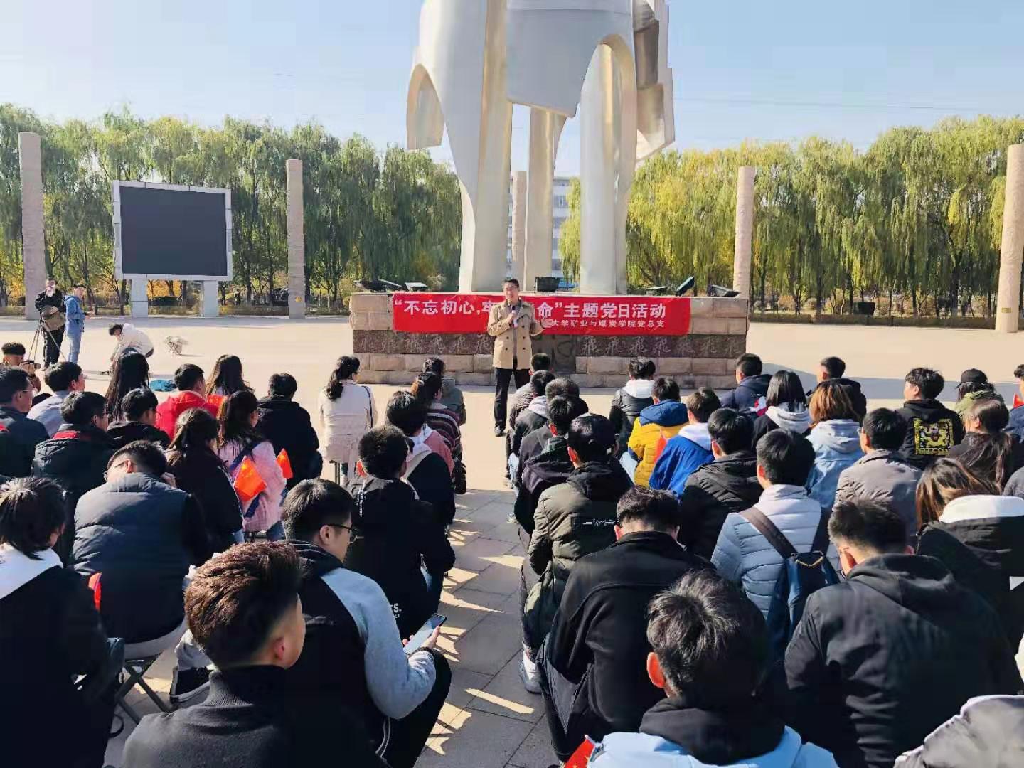 2019年10月26日上午,beat365中文唯一官网组织全体学生党员到北方兵器城开展庆祝中华人民共和国成立70周年“不忘初心、牢记使命”主题党日活动,学院党总支组织委员、学生党支部书记胡显峰老师为学生进行主题党日教育现场讲党课。党课主要围绕以下内容展开讲解: