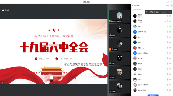 2022年3月22日晚19:30,beat365中文唯一官网学生第三党支部于腾讯会议平台召开党员党课学习,本次学习的主题是:学习贯彻党的十九届六中全会精神。领学人:闫妍同志。