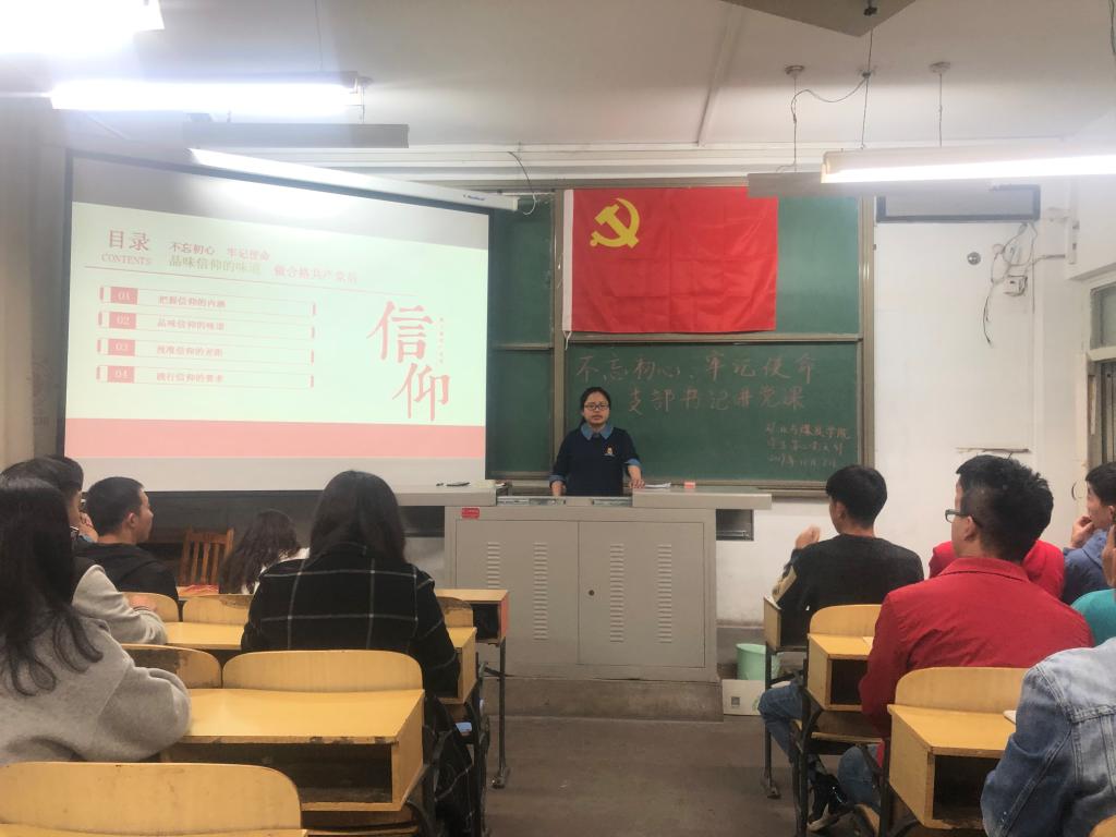 2019年11月7日19:00,beat365中文唯一官网学生第二党支部在临曦楼208举办“不忘初心、牢记使命”主题教育之“品味信仰的味道,做合格共产党员”支部书记讲党课活动,俞文琳同志为主讲人,学生第二党支部党员参加学习。