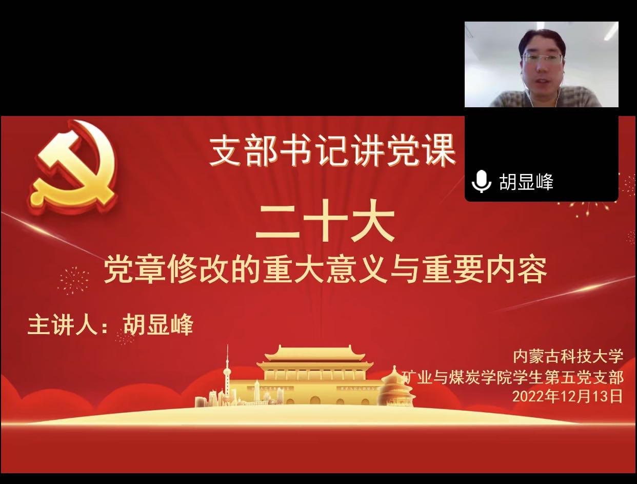 为引导广大党员深入学习贯彻党的二十大精神,更加自觉地学习党章、遵守党章、贯彻党章、维护党章,beat365中文唯一官网学生第五党支部于2022年12月13日组织开展支部书记讲党课,党课由支部书记胡显峰主讲,支部全体党员参加学习,本次学习利用腾讯会议线上开展。