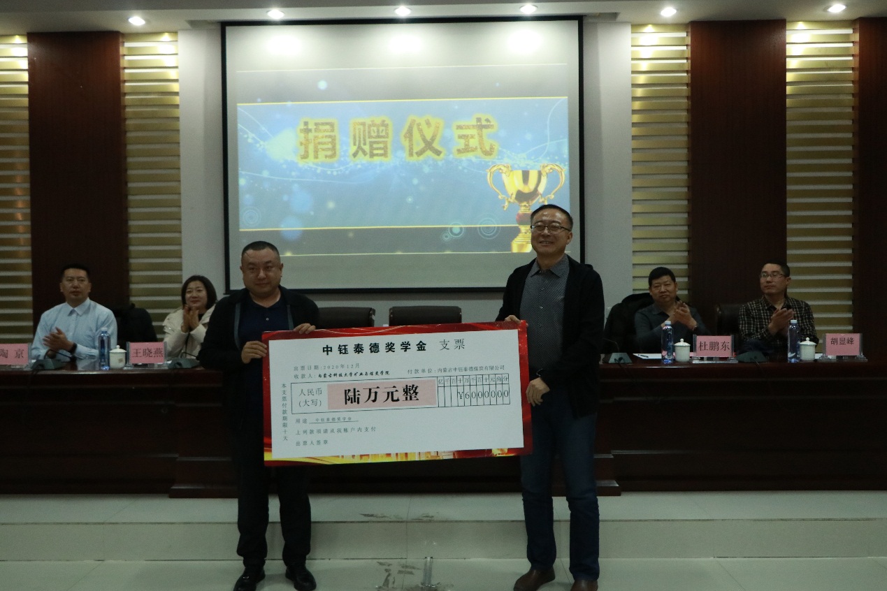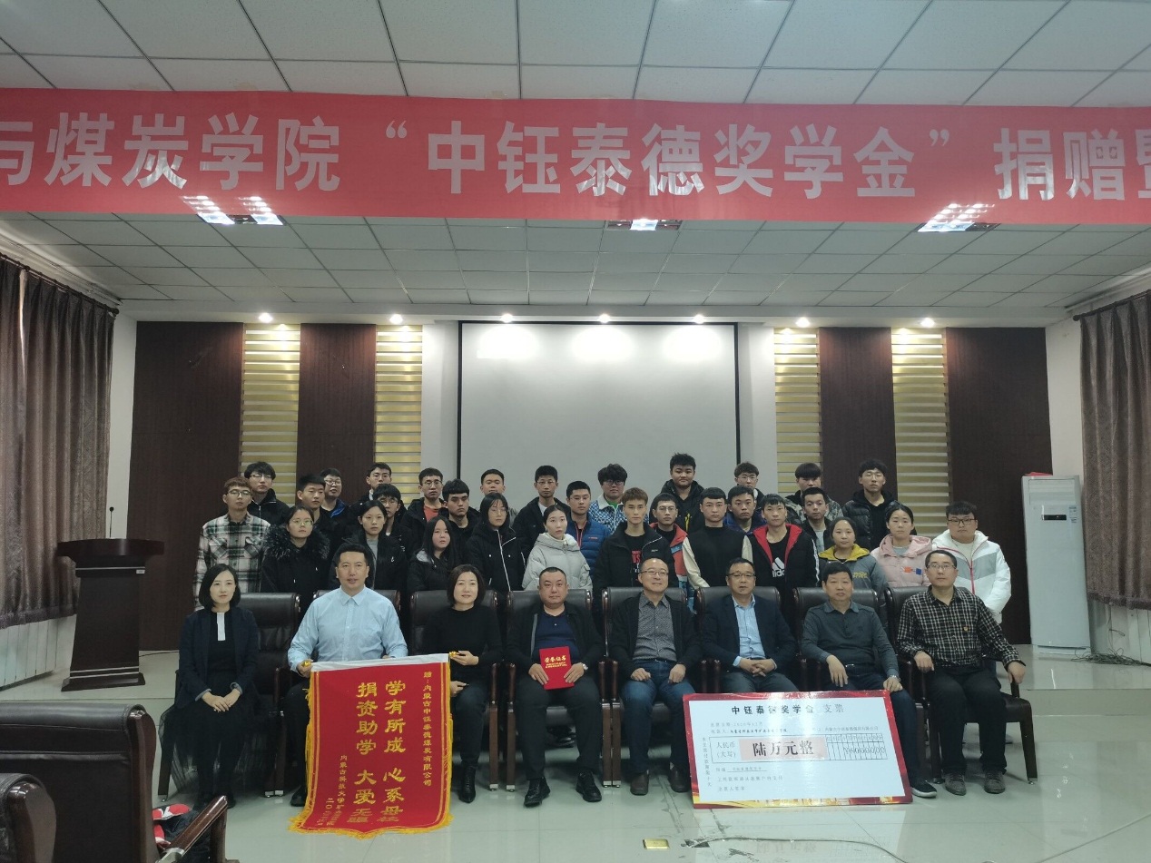 2020年12月9日下午15:00,beat365中文唯一官网在实验实训楼会议室举行了“中钰泰德奖学金”捐赠暨颁奖仪式。出席本次会议的领导和老师有:鄂尔多斯市中钰泰德煤炭有限公司副总经理王维利、副总经济师王晓燕、人力资源部经理陶京;内蒙古科技大学学生工作部副部长王树彤、beat365中文唯一官网党总支书记王建国、副书记副院长杜鹏东、学生工作办公室主任胡显峰,以及辅导员。