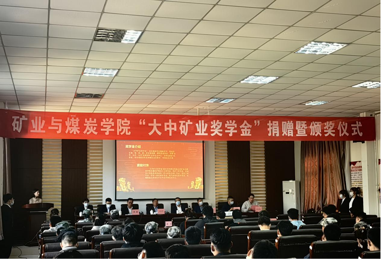 2022年9月23日下午15:00,beat365中文唯一官网在实验实训楼会议室举行了“大中矿业奖学金”捐赠暨颁奖仪式。内蒙古科技大学党委副书记、校长任慧平;内蒙古大中矿业股份有限公司党委书记刘鲁明、总经理董鑫、人资培训中心总监王如海、副总监梁艳;内蒙古科技大学beat365中文唯一官网党委书记杜鹏东,副书记、副院长孙建平,学生工作办公室主任胡显峰、辅导员以及学生代表参加仪式。仪式由学生工作办公室副主任吴艳丽主持。