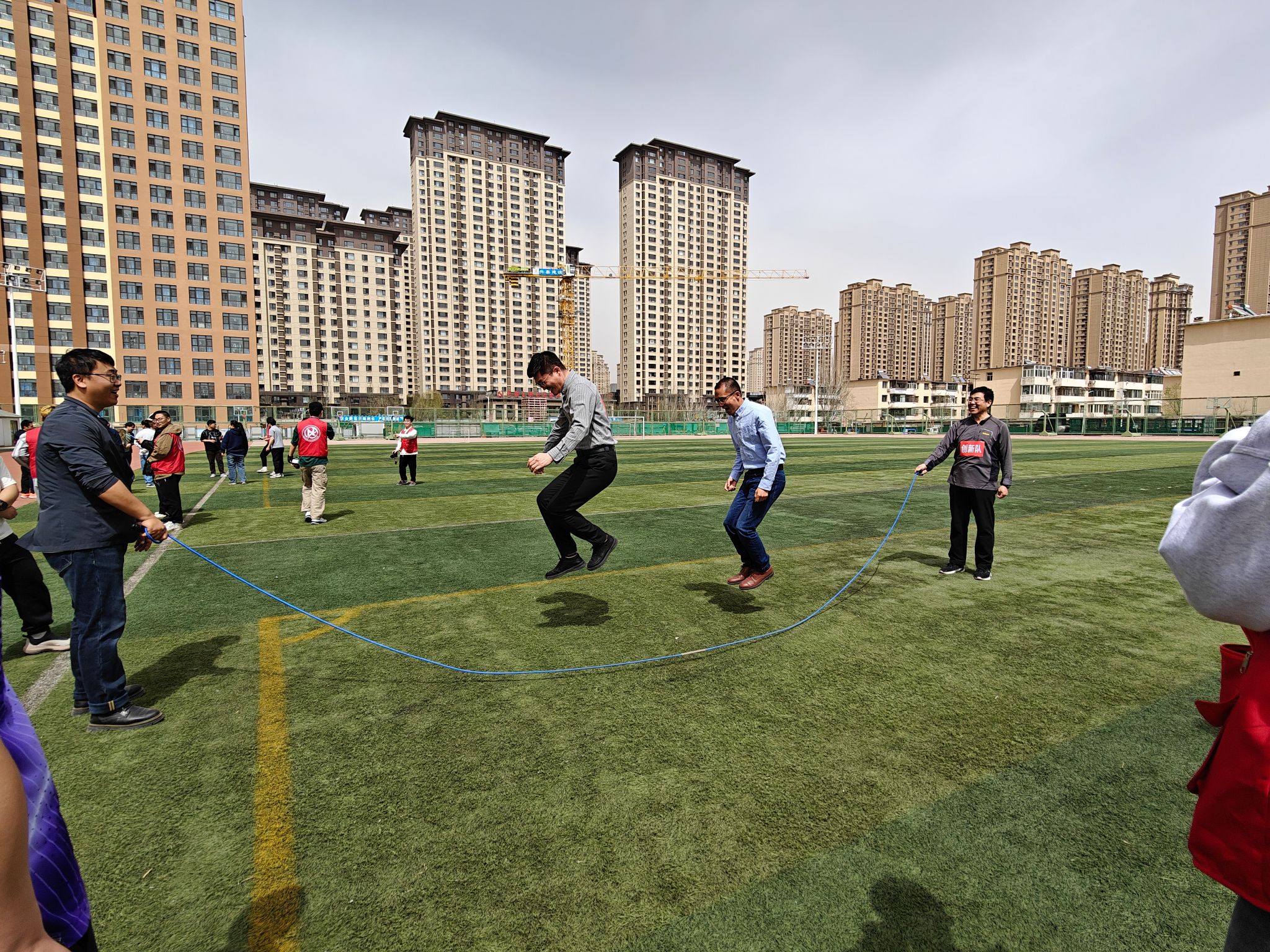 比赛中,各队教职工热情高涨,既有紧张激烈的竞争,又有欢声笑语的互动。团结队在“五人六足”项目中配合默契,步伐一致;创新队在“毛毽互传”中展现出高超的技巧;奋斗队和自强队在“跳大绳”环节中稳扎稳打;而拼搏队则在“穿越呼啦圈”中表现突出,动作敏捷。