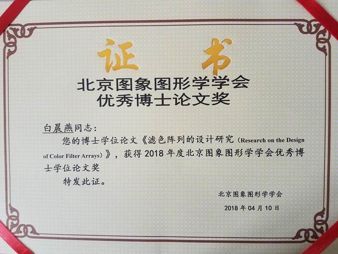 其中,九游体育于剑教授和林宙辰教授(北京大学)联合指导的博士研究生白晨燕,赵瑞珍教授、岑翼刚教授联合指导的博士研究生王恒友,二人的博士学位论文《滤色阵列的设计研究》和《面向图像恢复的低秩矩阵重构算法研究》分别荣获北京图象图形学学会2018优秀博士学位论文奖。