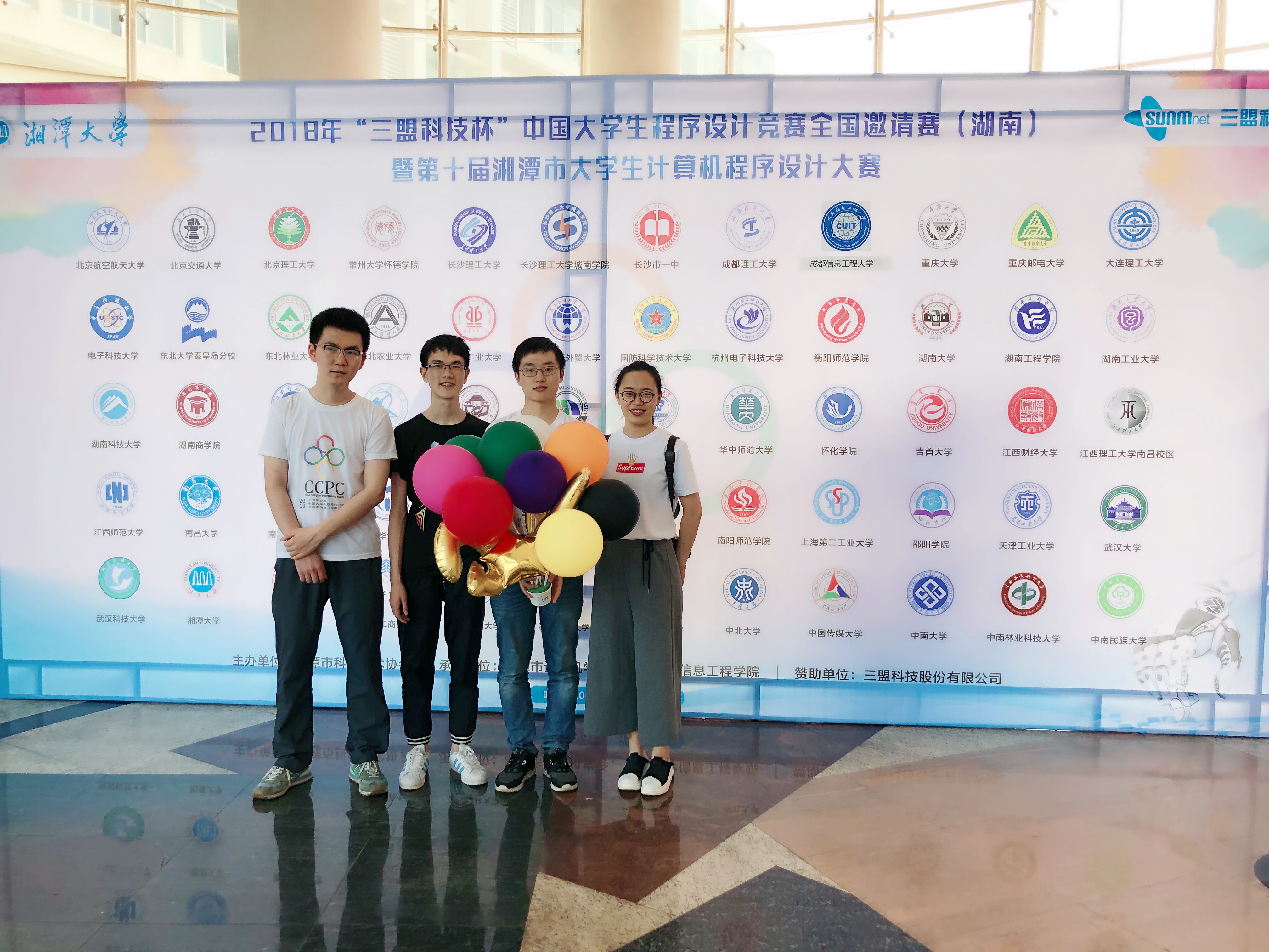 2018年第4届CCPC(中国大学生程序设计竞赛)全国邀请赛湘潭赛站于2018年5月12日-13日在湘潭大学举行。九游体育派出参赛队伍——“猜歌群”队(何卫锋、郑黎明、王天舒)赴现场参赛。来自全国60所高校的177支队伍展开激烈角逐。在本赛站的开幕式上,九游体育ACM教练许华婷应邀代表参赛教练发言。湘潭市科学技术协会党组书记、主席涂敬阳,湘潭市人民政府秘书长刘定良,湘潭市科学技术协会副主席蒋长湘,湘潭市计算机学会理事长刘任任,湘潭大学副校长刘建平,湘潭大学科协秘书长许斌等出席闭幕式。