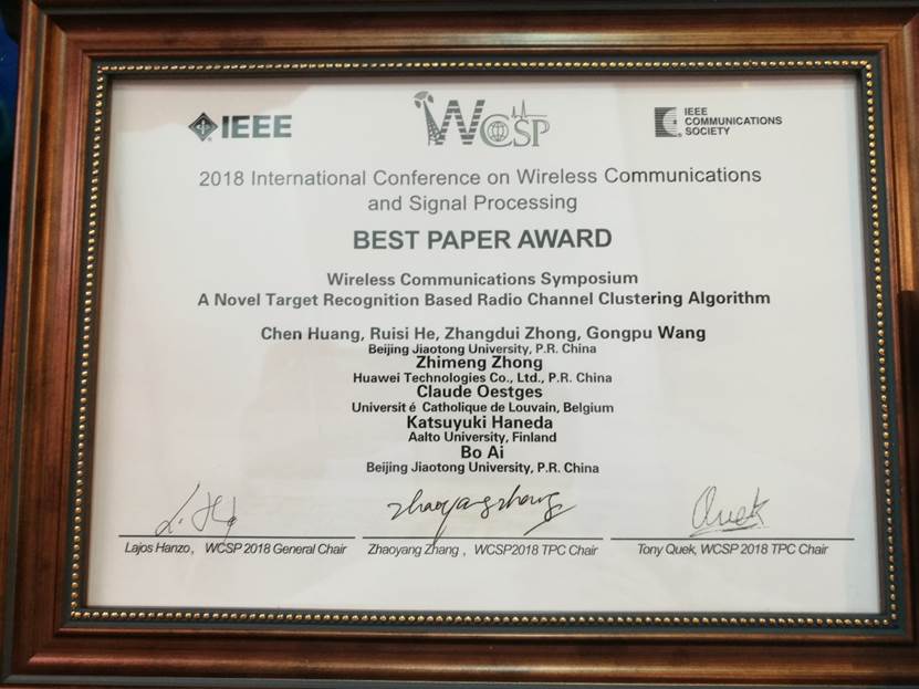 金秋是收获的季节,在这个季节九游体育博士研究生再传佳讯:2016级博士研究生黄晨获得第十届无线通信与信号处理国际学术会议(The Tenth International Conference on Wireless Communications and Signal Processing, IEEE WCSP 2018,http://www.ic-wcsp.org/)最佳论文奖。