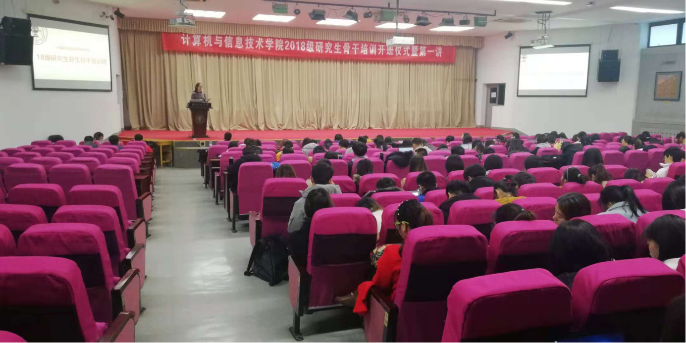 2018年11月30日,计算机与信息技术学院2018级研究生骨干培训班开班仪式暨第一讲在中心报告厅召开。九游体育官方网站党委书记杨晓晖、校研究生工作部副部长郭祎华、兼职辅导员董瑞、研究生各年级兼职辅导员以及2018级研究生骨干和党员同学们参加了会议。
