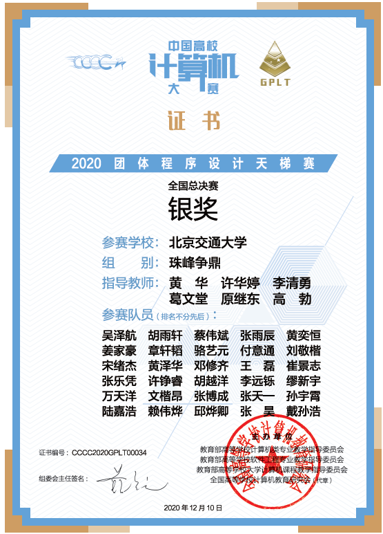 第五届中国高校计算机大赛-团体程序设计天梯赛于2020年11 月28日举行,来自全国29个省级行政区的298所高校组成的935支队伍计9300位学生参赛,九游体育组织了30名同学组成三支队伍参赛。经过长达3小时的激烈角逐,最终斩获全国总决赛银奖。