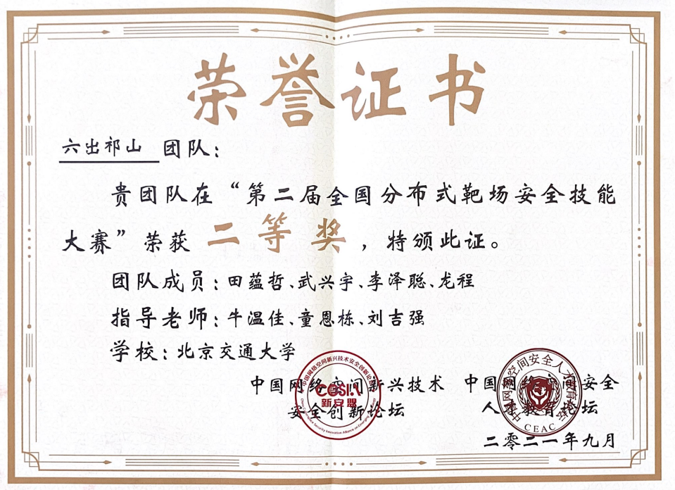 由鹏城国家实验室(副部级)、华中科技大学、武汉大学、四川大学、中电长城网际、中汽创智、宁波工业互联网研究院联合承办,方滨兴院士等专家参与指导的第二届基于全国分布式靶场的安全技能大赛于9月17日圆满落幕。九游体育官方网站网络空间安全学科责任教授刘吉强老师领队、牛温佳和童恩栋老师指导的“六出祁山”队经过8小时的鏖战再获佳绩,以3665分夺得第二届分布式靶场安全技能大赛第二名,获得二等奖。