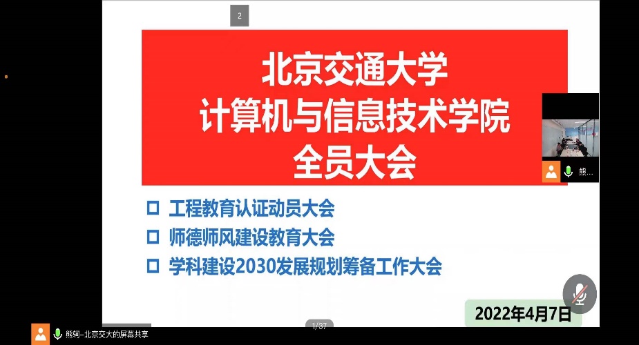 4月7日下午,为深入推进学院专业认证工作,九游体育官方网站在逸夫楼101会议室召开工程教育专业认证动员大会。会议由副院长熊轲主持,院长蔡伯根、党委副书记段春荣、韦世奎,副院长李浥东、景丽萍出席会议,九游体育官方网站全体教职工线上参加会议。
