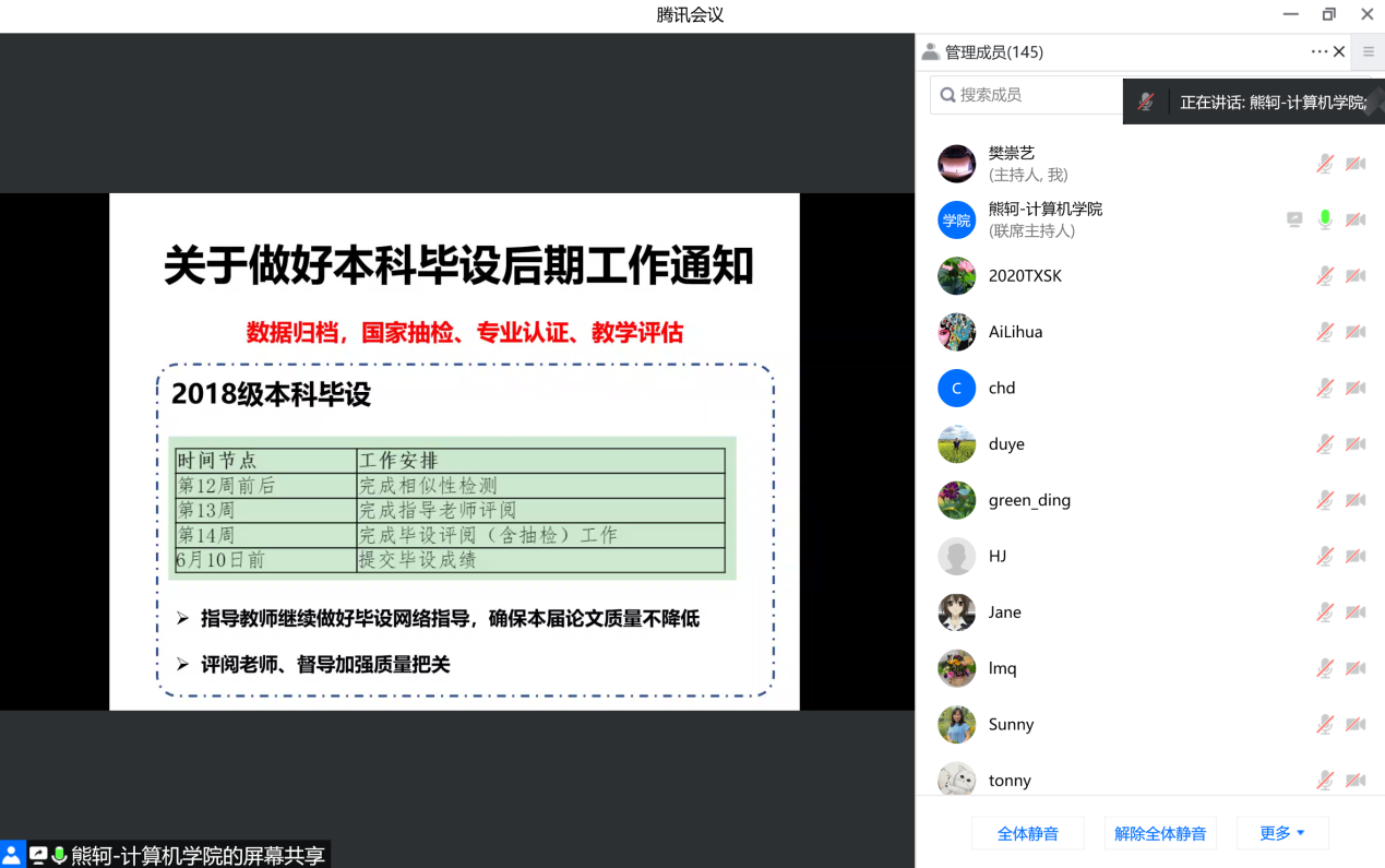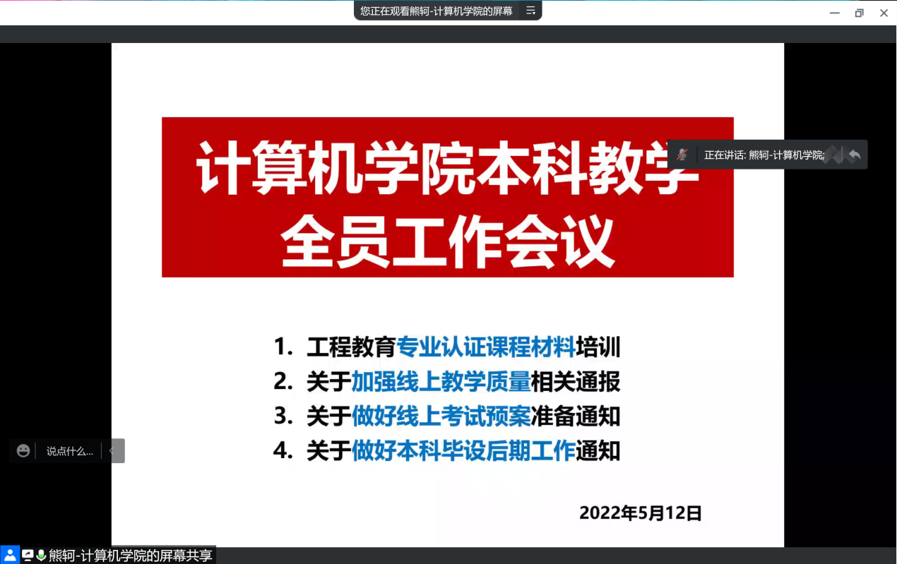 九游体育官方网站对本科人才培养工作极为重视。5月12日上午,学院召开线上本科教学全员工作会议,所有院领导以及全院教师近150人参会。会议由副院长熊轲主持。