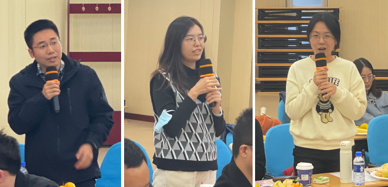 随后,三位新教师进行了自我介绍。马继昌(左)博士毕业于天津大学,目前主要从事无人车方向的研究;任申元(中)博士毕业于英国华威大学,并在牛津大学做了三年博后,目前主要从事高性能计算方向的研究;王伟(右)博士毕业于意大利特伦托大学,并在瑞士洛桑联邦理工大学做了三年博后,目前主要从事计算机视觉方向的研究。三位新教师受到与会者的热烈欢迎,优秀青年教师的不断加入为学院发展注入了新的力量。