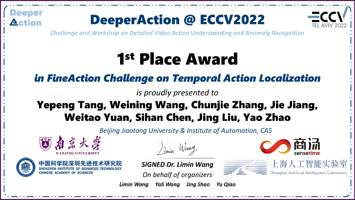 近日,九游体育官方网站赵耀教授带领的MePro团队与中科院自动化所刘静研究员带领的团队合作参加了ECCV 2022的DeeperAction挑战赛,获得了时序动作定位挑战赛冠军。挑战赛第一完成人唐业鹏是张淳杰教授指导的硕士研究生。团队成员包括:唐业鹏、王卫宁、张淳杰、江洁、原洧涛、陈思涵、刘静、赵耀。