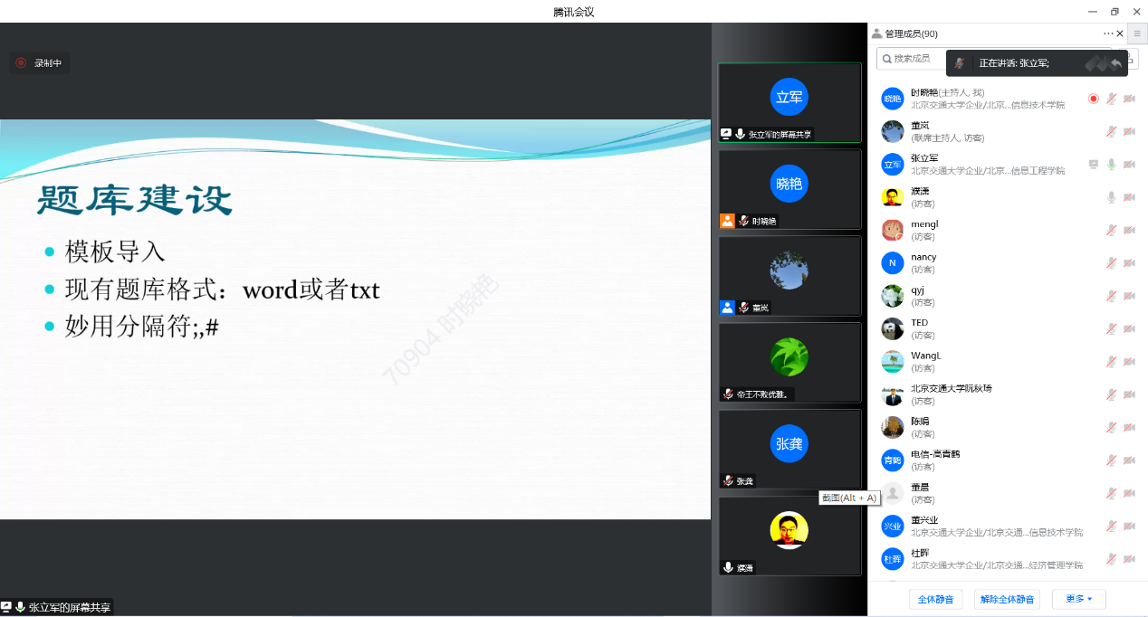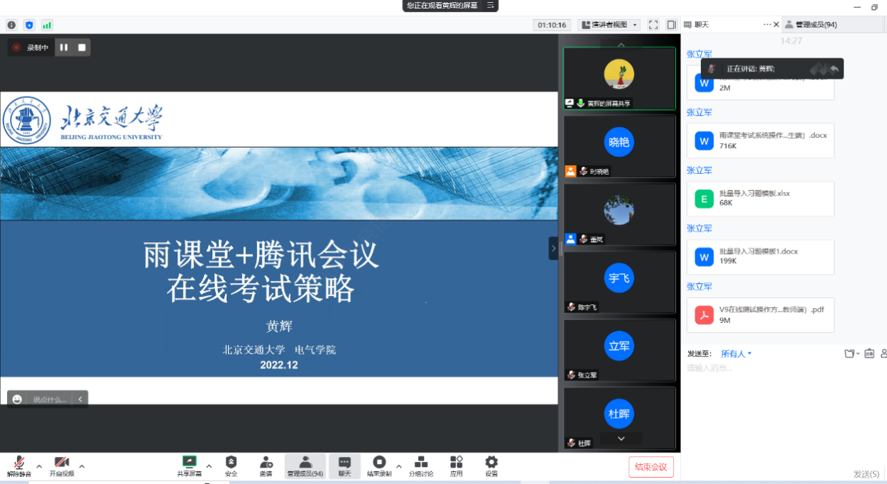 本次会议邀请到了北京市教学名师、电气学院教授黄辉老师和校教师发展中心新媒体组骨干、电子与信息工程学院张立军老师,面向九游体育官方网站全院老师通过腾讯会议做了期末线上考试培训与经验分享。两位老师分别就如何使用雨课堂、课程平台组织出题、监考、防止作弊等进行了详细介绍和分享。全校90多位老师参加了本次活动,参会老师们与两位报告专家在线上进行了热烈的交流和讨论。