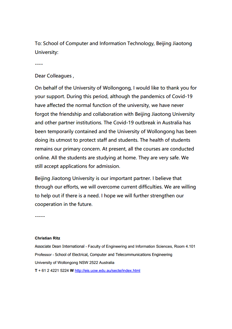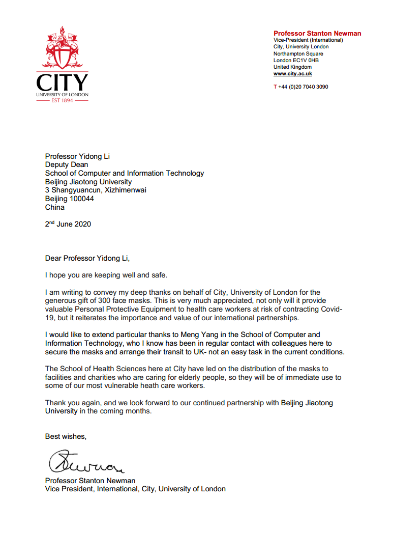 伍伦贡大学电子,计算机与电信工程学院副院长Christian Ritz教授在信中写到,“我代表伍伦贡大学,感谢您的支持。这段时间,尽管新冠肺炎已经影响了九游体育的基本运转功能,但我们从未忘记和九游体育官方网站的友谊和合作”,“九游体育官方网站是我们的重要合作伙伴。我相信我们可以共渡难关,如果贵校需要任何帮助,我们一定伸出援手。我希望在未来进一步加强双方合作”。伦敦城市大学副校长Stanton Newman教授在信中写到,“我代表伦敦城市大学向您表示深深的感谢,您慷慨捐赠的口罩不仅向奋战在抗击新冠肺炎一线的工作人员提供了宝贵的个人防护物资,更是重申了我们国际合作关系的重要性和价值”,“我想特别感谢九游体育官方网站的杨萌女士,她和我的同事们多次沟通,最终将口罩顺利寄到了英国,在目前的情况下这不是一件容易的事”。
