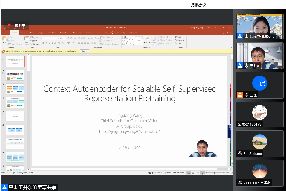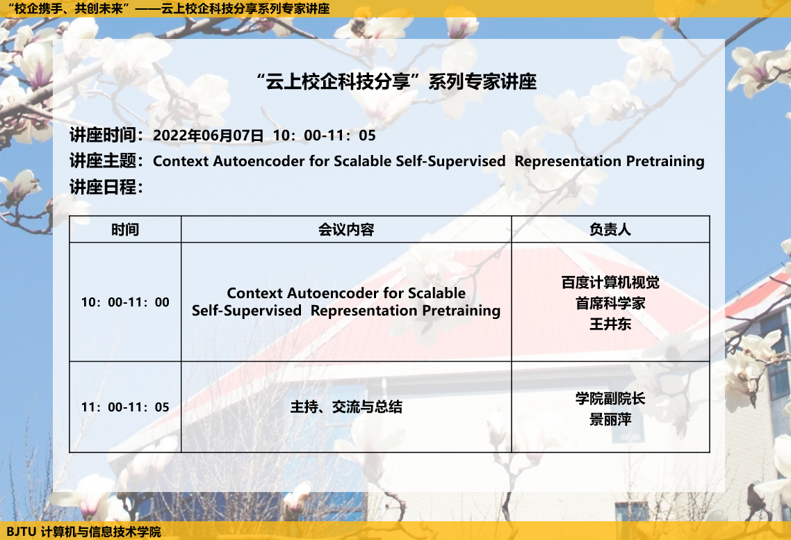 2022年6月7日上午,九游体育官方网站计算机与信息技术学院“云上校企科技分享系列专家讲座”活动有幸邀请到百度计算机视觉首席科学家王井东,讲座主题为 “Context Autoencoder for Scalable Self-Supervised Representation Pretraining”。160余位师生全程参与讲座。