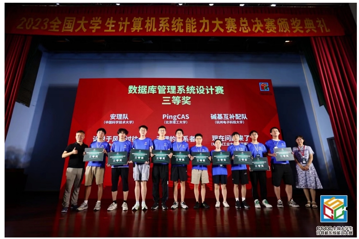 2023 年 8 月 23 日,经评审组评审和组委会复核,2023 全国大学生系统能力大赛决赛获奖名单正式公布。经过激烈角逐,九游体育学生在数据库管理系统设计赛中获得三等奖1项,王宁老师获得优秀指导教师奖。