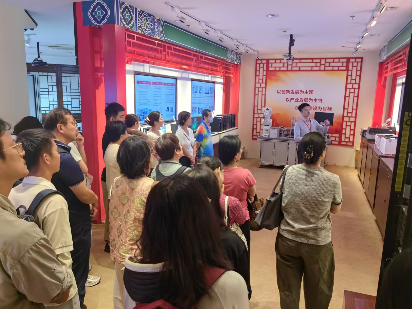 学院党委书记贾卓生、副院长(主持工作)李浥东带队,学院70余位教职工党员首先分组参观了龙芯中科总部展厅,在副总裁张戈的解说带领下,详细了解了龙芯中科的发展历程、核心技术和产品应用情况。特别是最新一代国产CPU的研发进展及其对于保障国家信息安全所起到的关键作用,给党员留下了深刻印象,纷纷表示要把这部分内容融入到课程思政中,增强学生对国内自主可控技术的理解和认识,同时激发学生爱国情怀和技术报国的热情。随后,党员们观看了龙芯中科企业宣传片,片中不仅展示了公司在科研创新方面取得的重大突破,同时也反映了龙芯党总支部带领全体员工积极投身于我国信息技术自主创新事业中的奋斗历程,进一步激发了党员的责任感和使命感。
