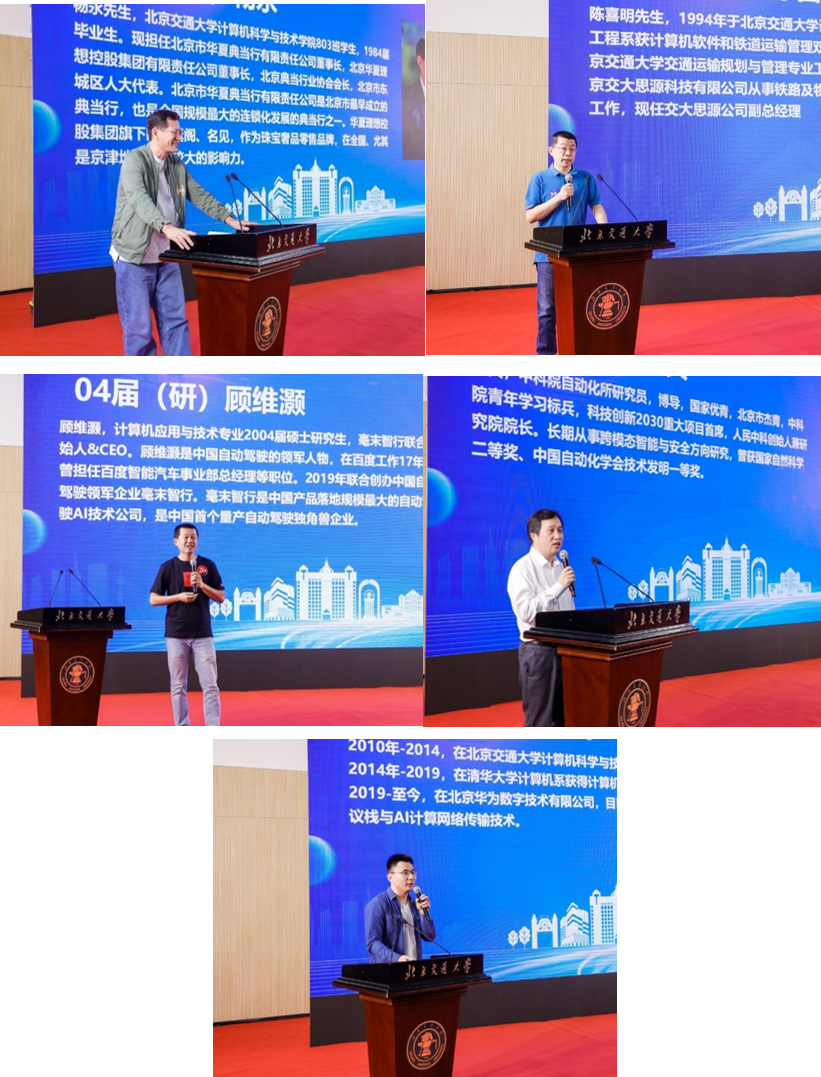 随后84届校友代表杨永,94届校友代表北京交大思源科技有限公司副总经理陈喜明,04届校友代表毫末智行科技有限公司CEO顾维灏,04届校友代表中科院自动化所研究员、博导、国家优青李兵、14届校友代表来自华为的徐安民分别发言,回忆在交大生活的点滴,表达饮水思源的感恩之情。