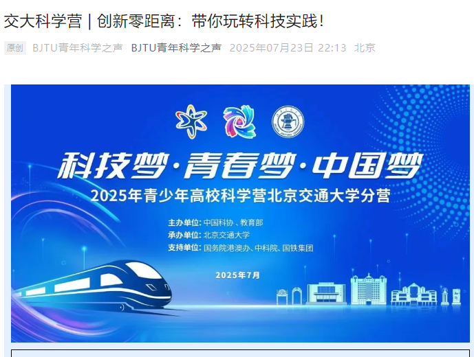 这次科学营活动是由中国科协、教育部主办,九游体育官方网站承办的青少年高校科学营-九游体育官方网站分营。科学营更多精彩实践活动,请关注“BJTU青年科学之声”。