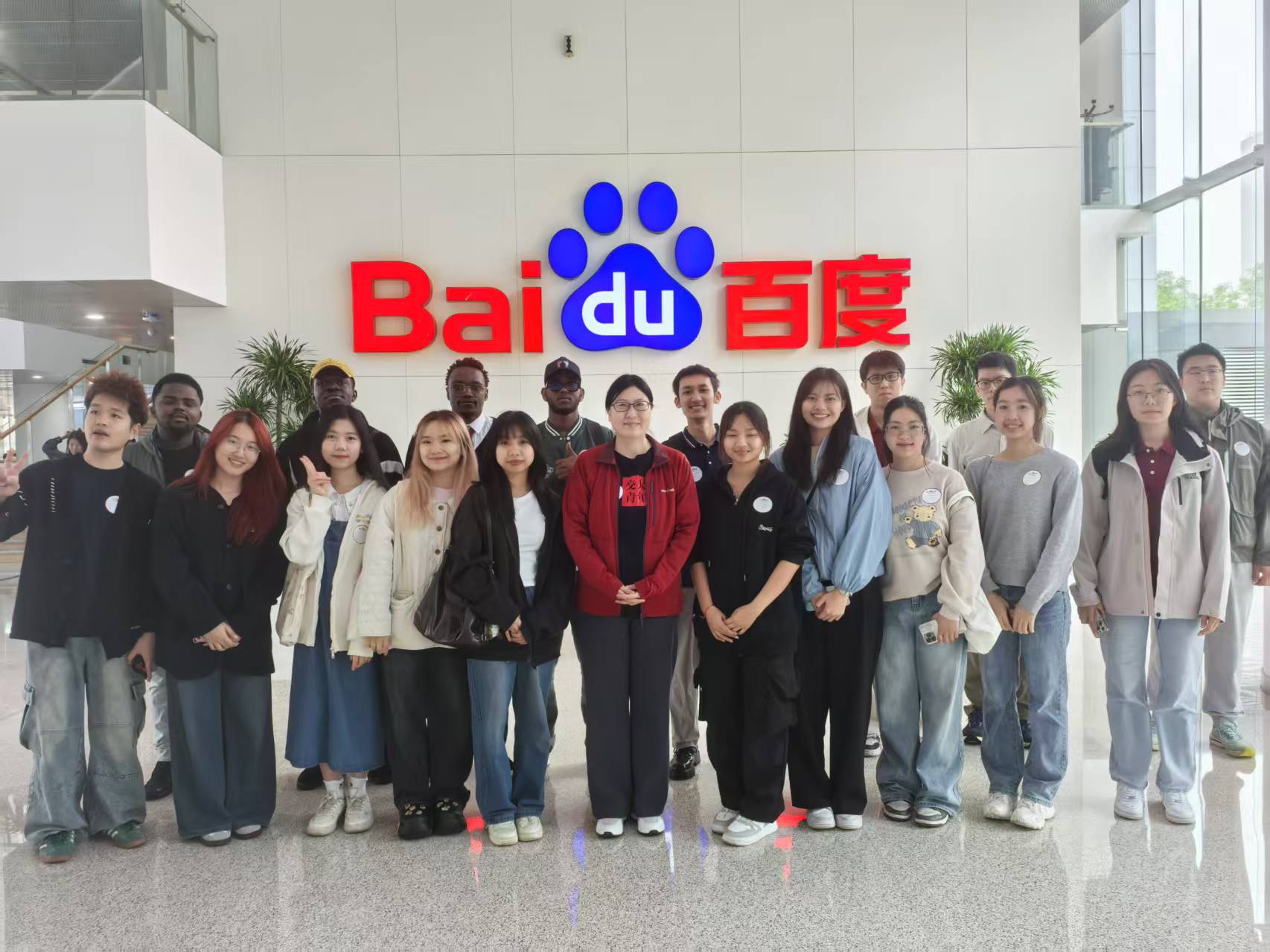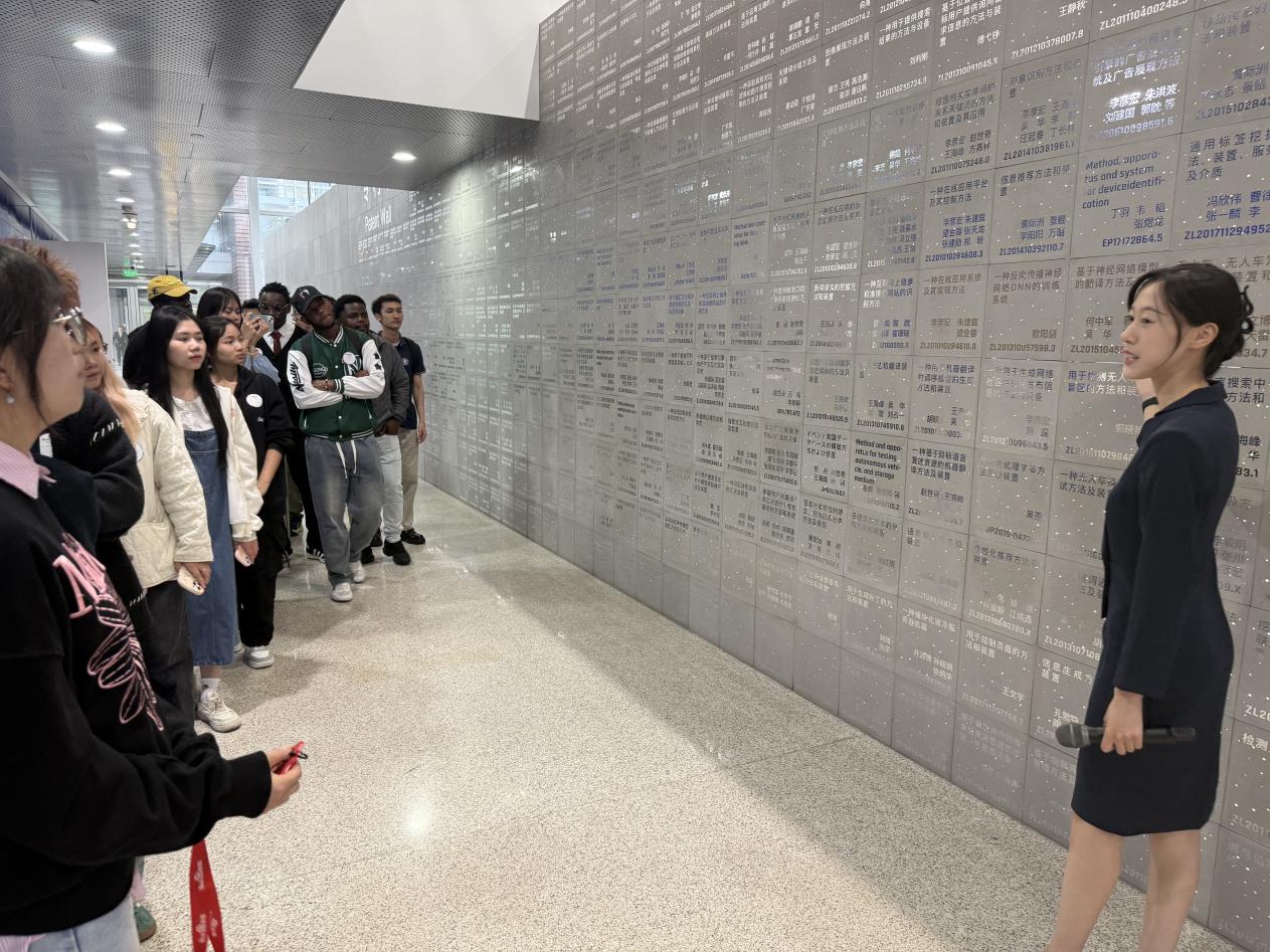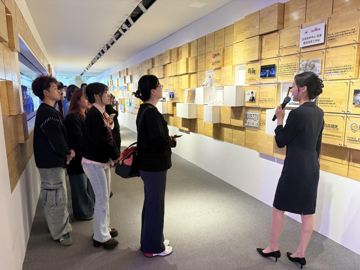 百度是伴随互联网和AI大潮快速发展的国内领先科技企业,科普参观内容涵盖百度AI核心和前沿技术—大数据、大模型、智能芯片、智能家居、自动驾驶等。百度科普展厅位于著名建筑师青山周平设计的百度大厦B座一层。活动伊始,讲解员带领同学们走进“百度之路”展区,详细介绍企业发展历程、理念使命,着重分享近年来在芯片、框架、模型及应用层面的代表性产品,生动展现百度以技术创新驱动变革,成长为行业领军者的奋进之路。