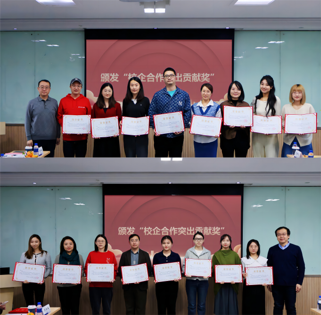 张博、贾卓生为与会企业代表颁发了“校企合作突出贡献奖”。